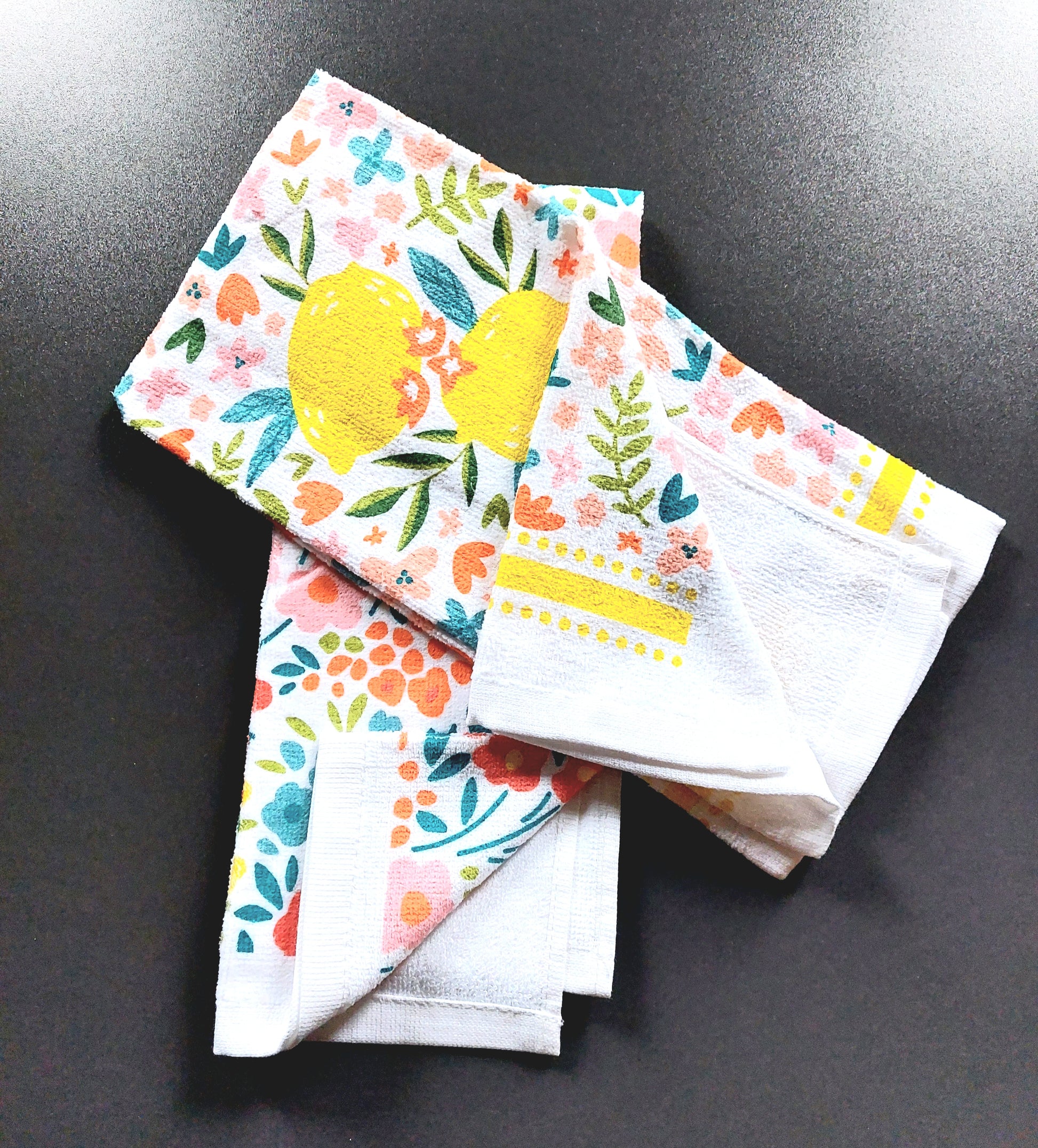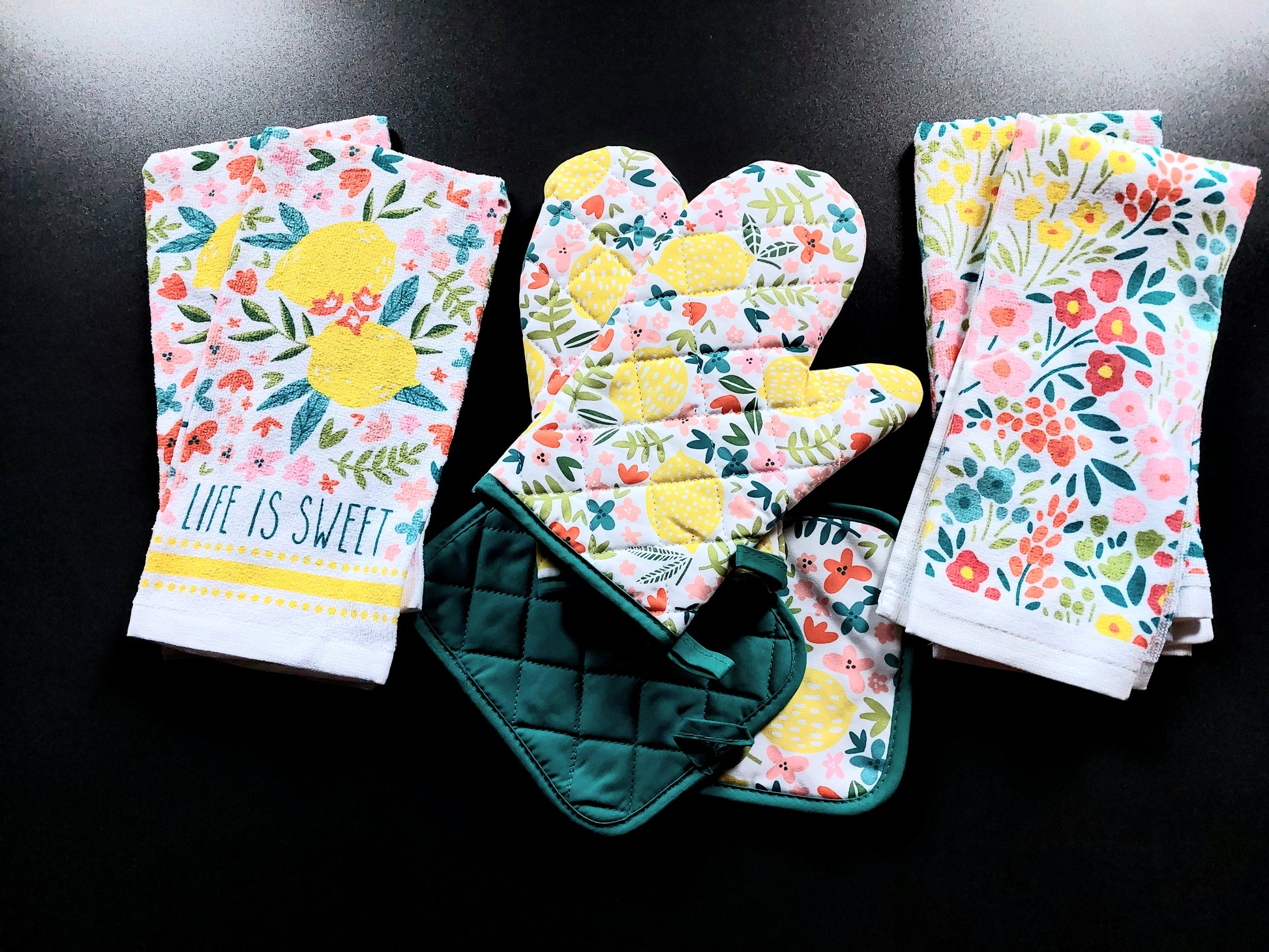 The "Flowers and Lemons" kitchen set comes with 8 pieces, including 4 kitchen towels,2 matching potholders and 2 oven mitts. A great value.