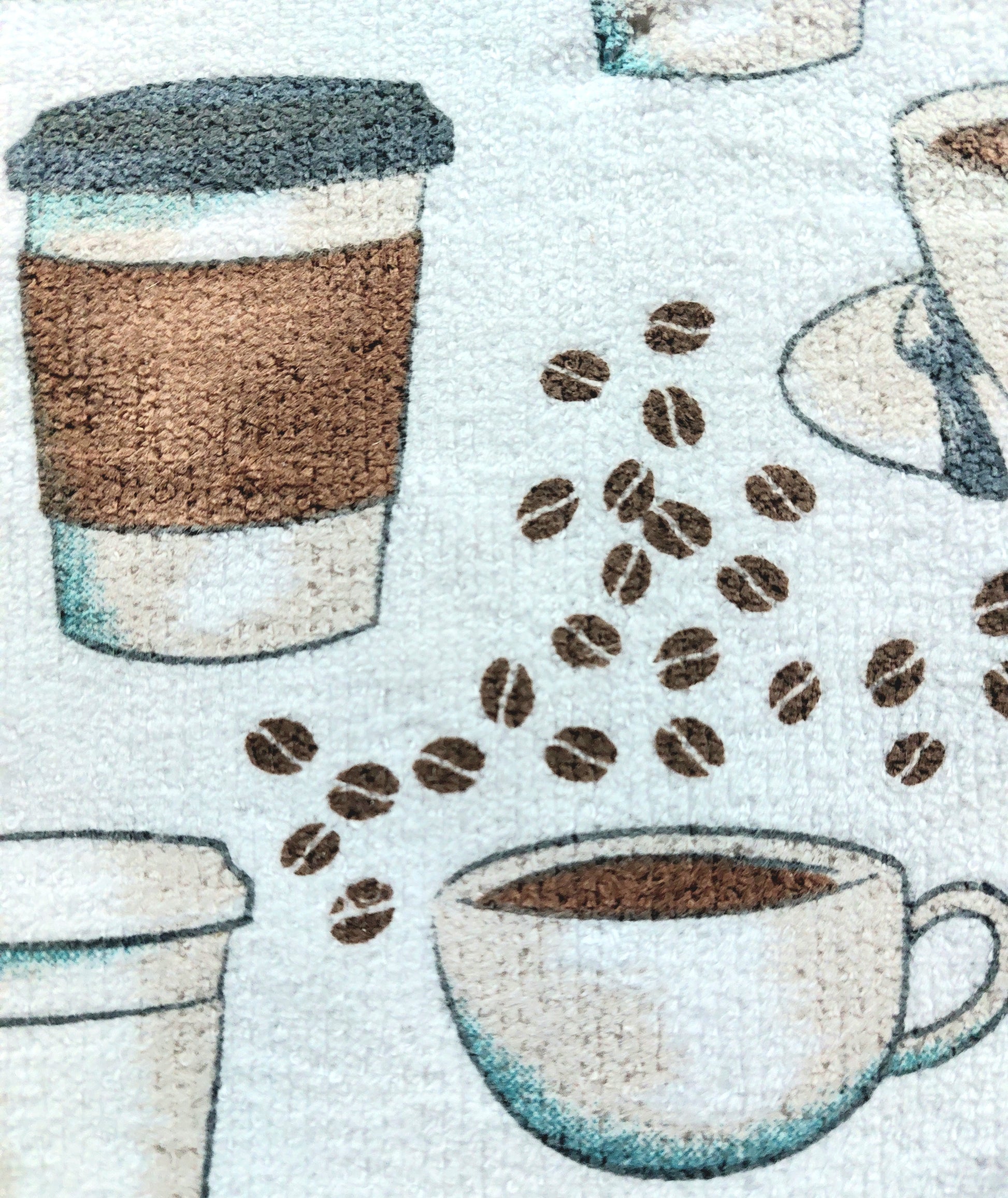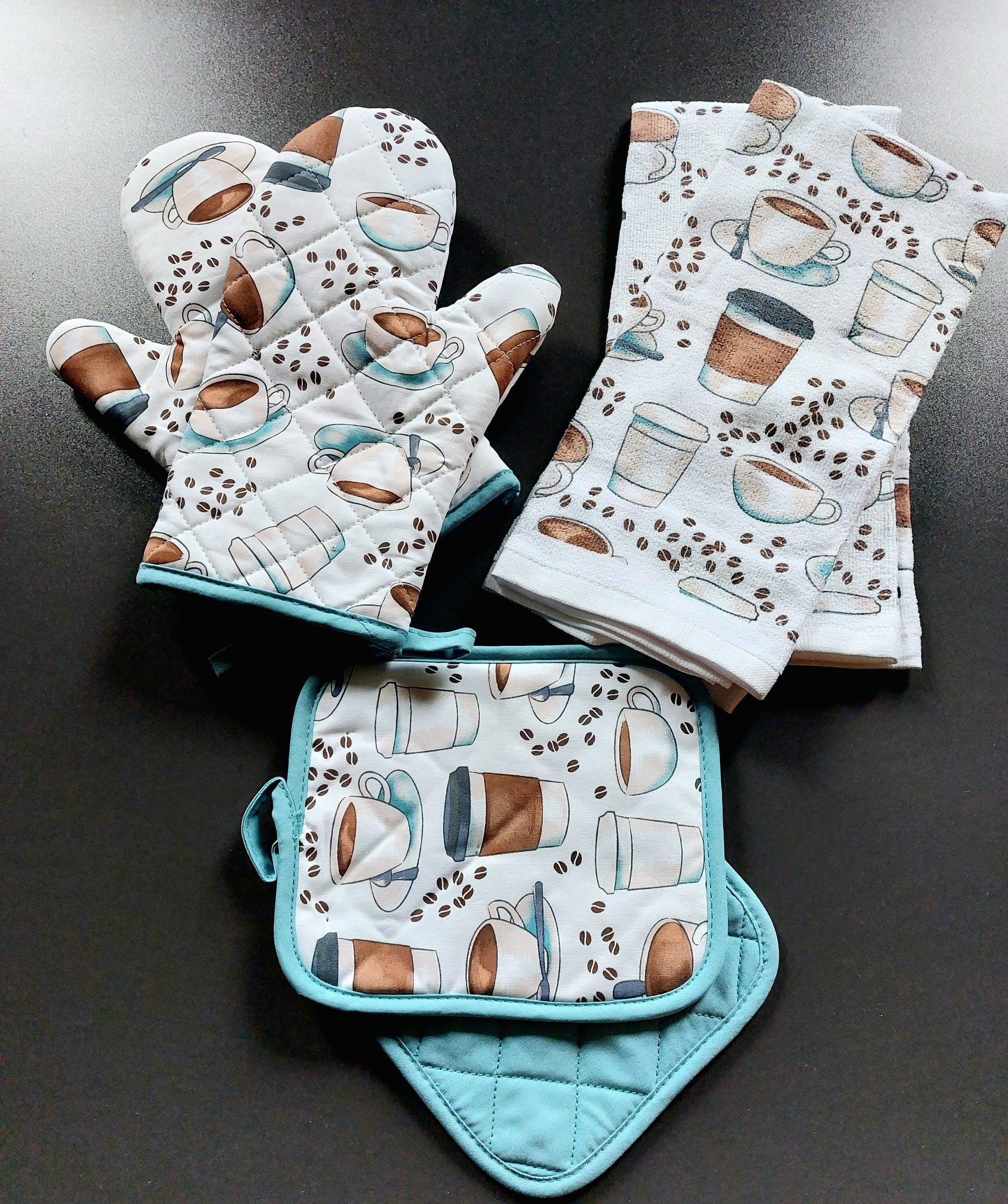 The "Coffee cups" kitchen set comes with 6 pieces, including 2 kitchen towels,2 matching potholders and 2 oven mitts. A great value.