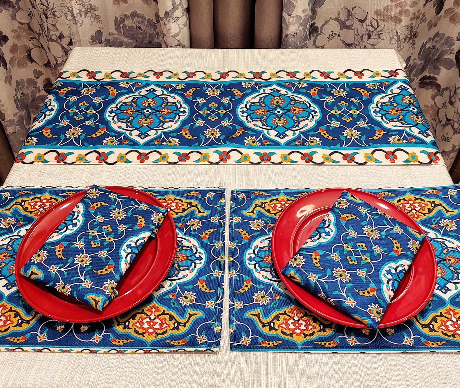 This table runner set is appropriate for a table that can seat 4 people. Versatile, it is good for dining tables, coffee tables, buffets, sideboards and more.
